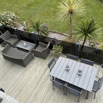 - Lower deck arm chairs with couch, dining furniture and umbrella on